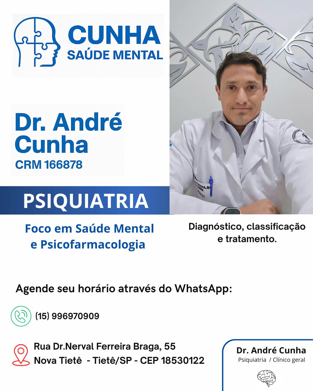Sou Dr. André Cunha, médico psiquiatra, intervencionistas e subespecialista em Psicofarmacologia, dedicado ao cuidado integral da saúde mental.